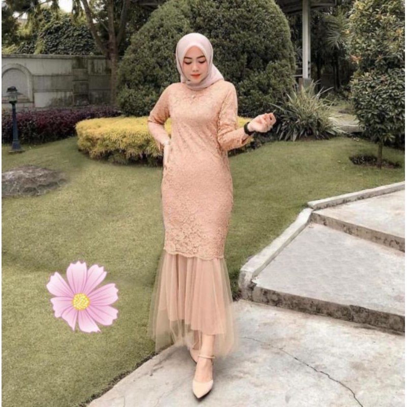 Baju Gamis Pesta Mewah Dan Elegan Rok Duyung Selendang Bahu Brokat Satin Peach Model Pakaian Muslim Model Pakaian Hijab Model Pakaian