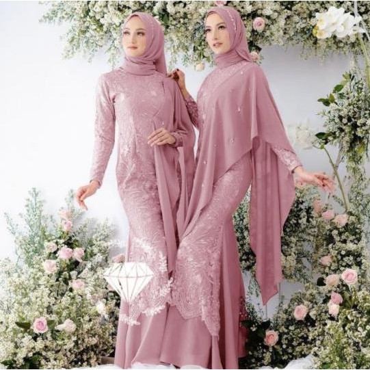 Baju Gamis Pesta Mewah Dan Elegan Rok Duyung Selendang Bahu Brokat Satin Peach Model Pakaian Muslim Model Pakaian Hijab Model Pakaian