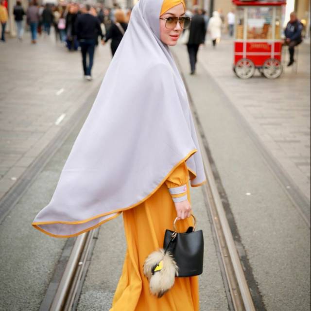 Set Gamis Aulia Bahan Wolly Crepe Warna Utama Kuning Warna Jilbabny Abu Muda Busui Saku Kanan Gamis Shopee Indonesia
